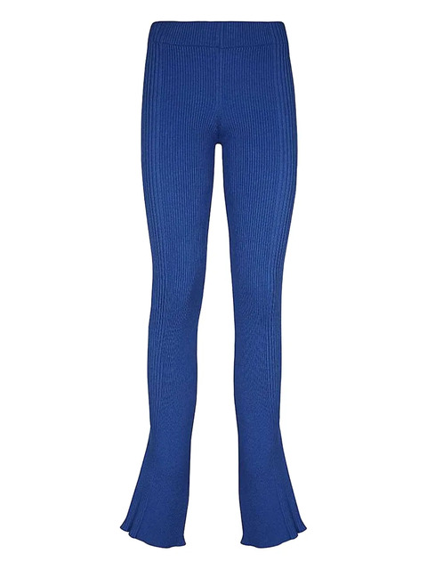 royal blue ribbed texture flared leg high waist clasp fastening monster face detail