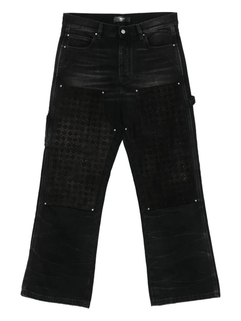 black denim knee-panel detail monogram pattern rivet embellishment utility pockets