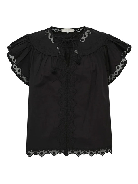 black flutter sleeves embroidered details v-neck eyelet trim gathered neckline