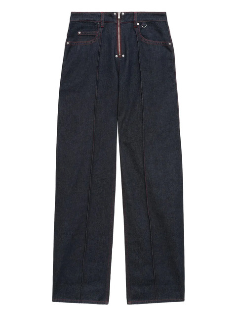 dark blue zip detail straight leg pressed crease belt loops multiple pockets