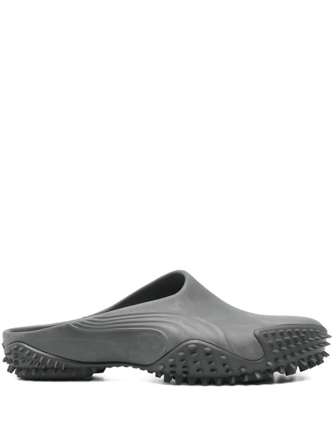 gray slip-on design sculpted sole studded sole curved toe flat heel