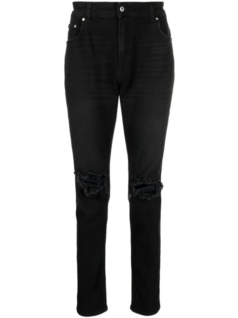 black stretch-cotton ripped detailing slim cut belt loops button fly fastening classic five pockets