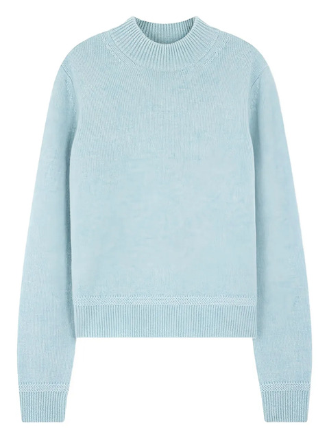 light blue mock neck ribbed trims long sleeves straight hem fine knit