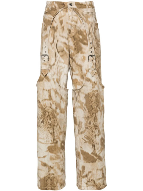 light brown/beige stretch-cotton twill weave all-over python print logo patch to the rear layered details belt loops coin pocket decorative buckle detail to the front two side slit pockets two rear patch pockets wide leg front button and zip fastening
