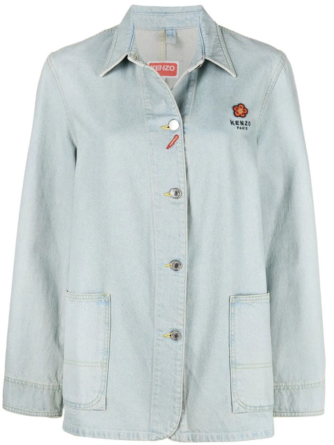 sky blue cotton embroidered logo at the chest floral embroidery pointed flat collar front button fastening two front patch pockets long sleeves straight hem