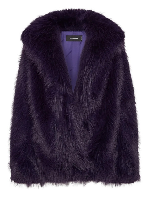 plum purple faux-fur design shawl lapels long sleeves logo-jacquard lining