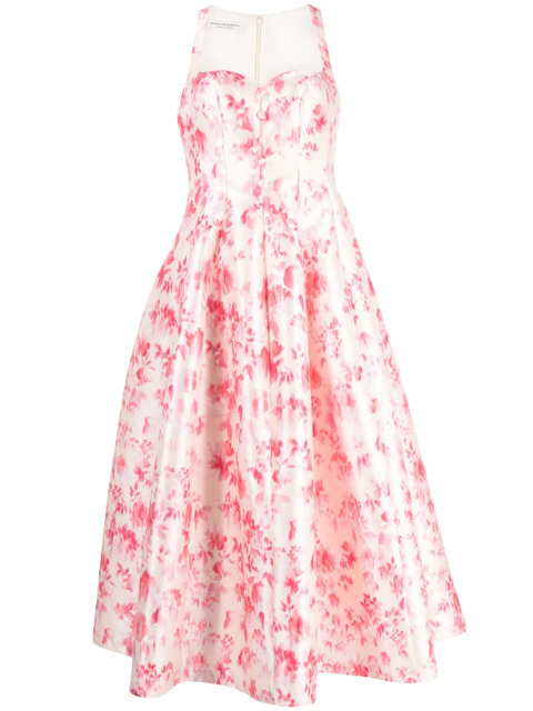 white/pink floral print sweetheart neck concealed rear zip fastening sleeveless flared skirt mid-length straight hem