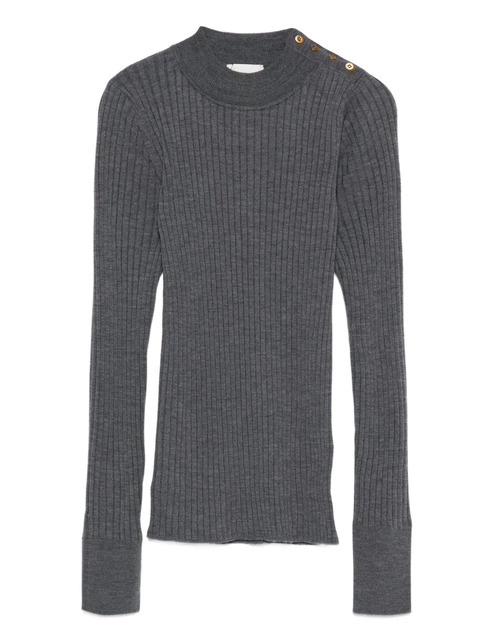 dark grey ribbed knit turtleneck long sleeves button detail shoulder close-fitting cuffs