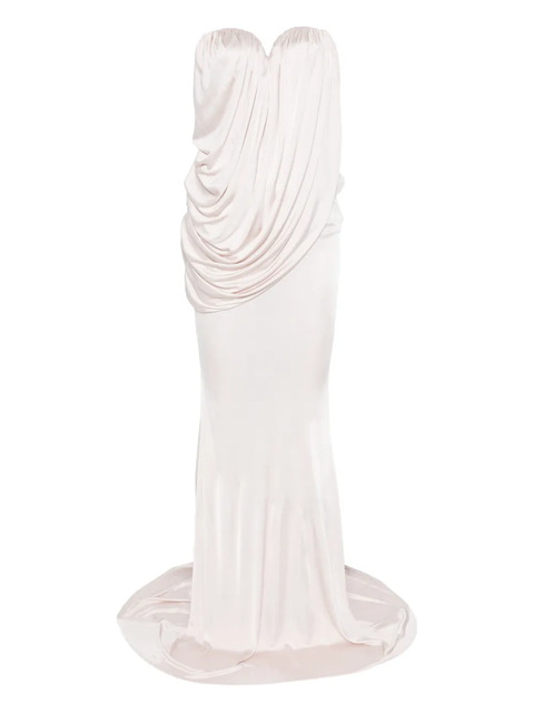 blush pink cowl neck draped bodice strapless floor-length mermaid skirt