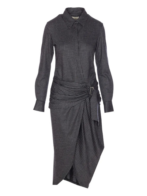 charcoal grey pinstripe pattern button closure long sleeves belted waist asymmetrical hem