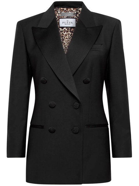 black crystal embellishment peak lapels double-breasted button fastening long sleeves buttoned cuffs chest welt pocket two front welt pockets straight hem leopard print lining