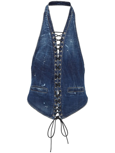 navy blue stretch-cotton denim front lace-up fastening halterneck open back internal logo patch