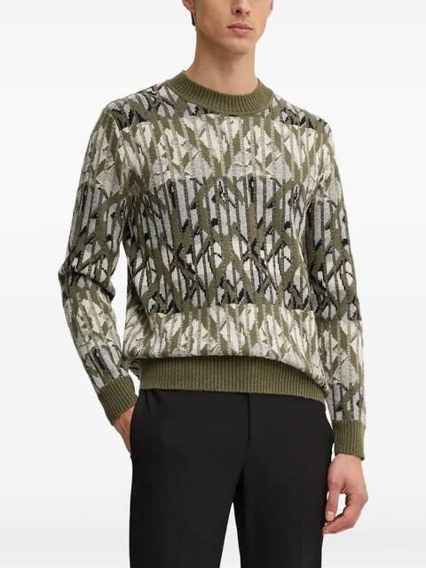 olive green geometric pattern jacquard knit ribbed crew neck long sleeves