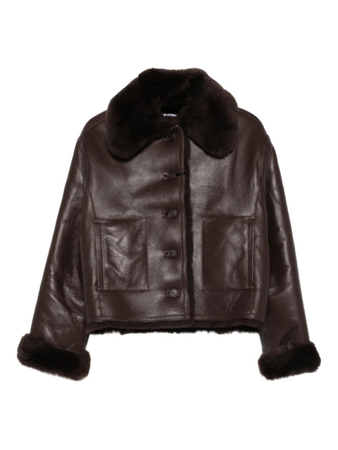brown leather faux fur collar button fastening patch pockets long sleeves