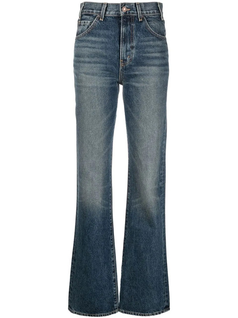 medium blue cotton flared belt loops front button and zip fastening classic five pockets