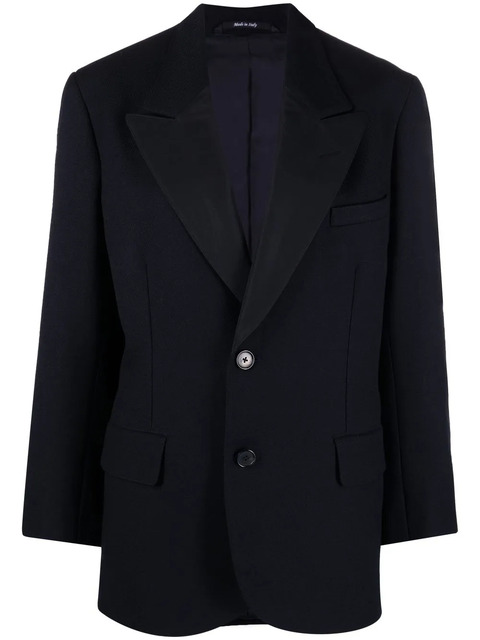 navy blue wool blend peak lapels front button fastening chest welt pocket dart detailing two front flap pockets long sleeves buttoned cuffs straight hem
