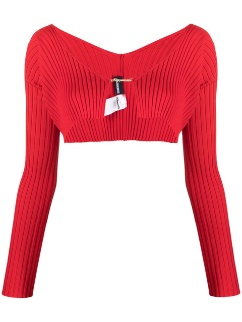 rose red ribbed knit logo charm round neck long sleeves cropped