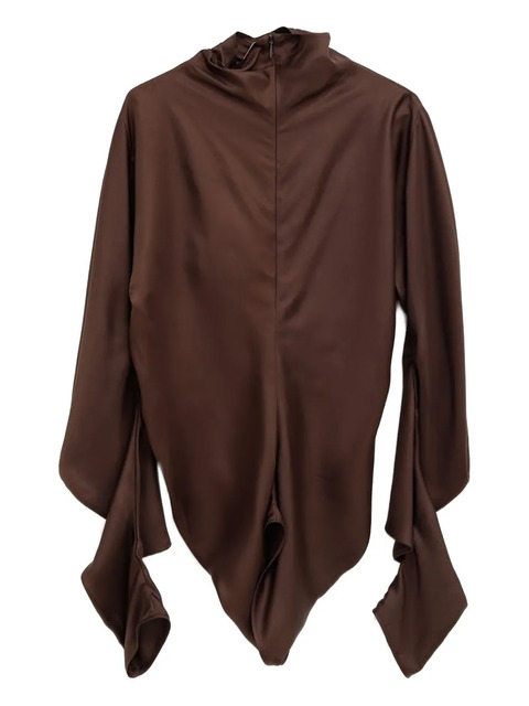 brown silk ruffled detailing long sleeves Just a reminder that this piece must be tried on over your own garments.