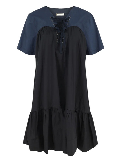 navy blue lace-up neckline short sleeves tiered hem relaxed silhouette