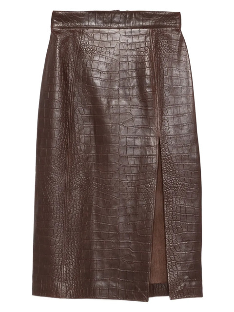 brown crocodile-effect leather side slit straight hem pencil shape