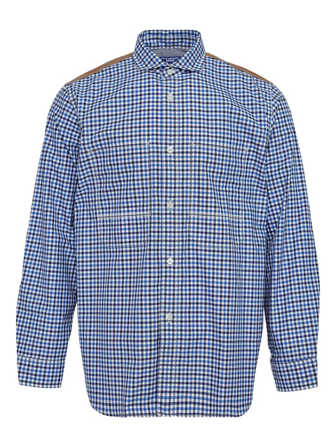 blue red check pattern brown suede elbow patches button fastening long sleeves cotton