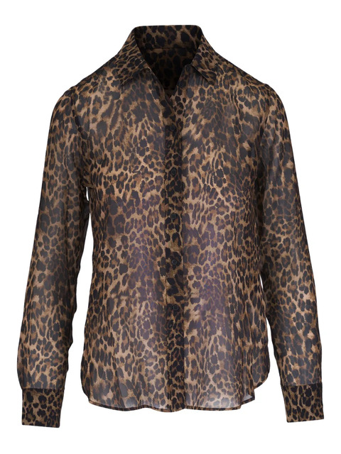 brown leopard print long sleeves button front sheer fabric