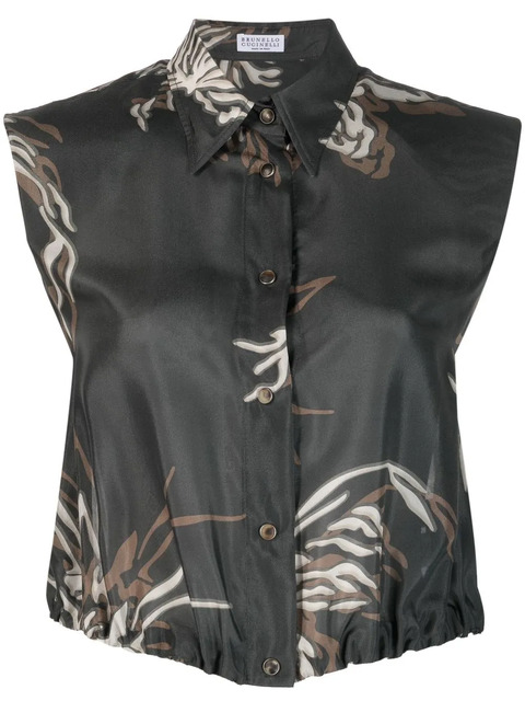 grey silk/brass all-over floral print classic collar sleeveless cropped elasticated hem button fastening