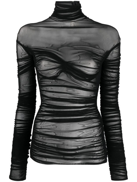 black stretch-design semi-sheer construction draped detailing high neck long sleeves straight hem