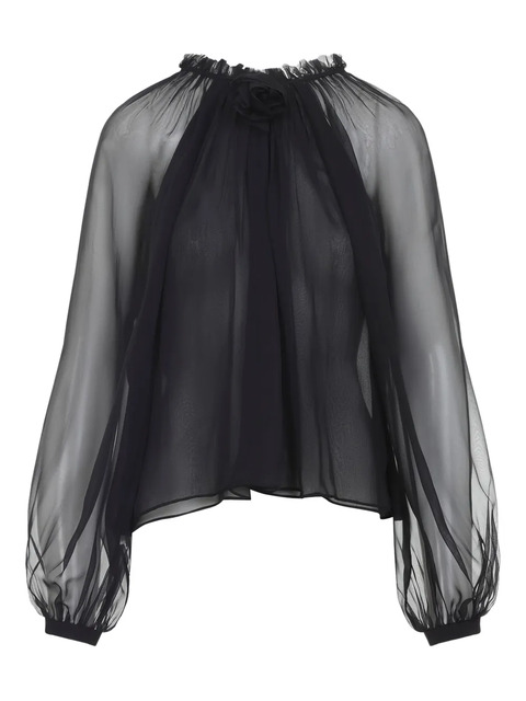 black silk ruffled neckline balloon sleeves high neck