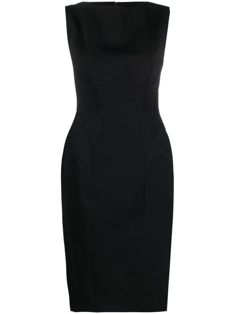 black twill weave stretch-design panelled design boat neck concealed rear zip fastening sleeveless structured waistline side slit knee-length straight hem