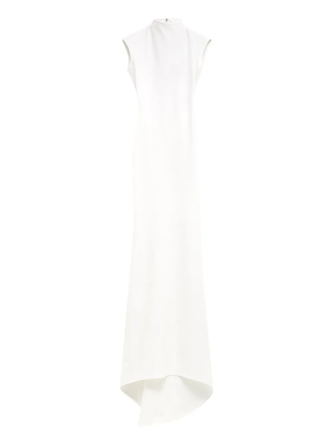 white high neck concealed back zip fastening sleeveless gathered detail to the back flared hem