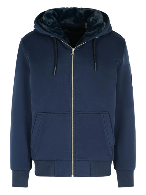 navy blue drawstring hood zip closure front pouch pocket metal logo patch removable faux fur lining