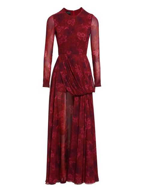 dark-red floral print long sleeves round neck draped skirt thigh-high split
