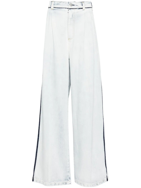 light blue cotton denim faded effect side stripe detailing contrasting trim high-waisted concealed fly and button fastening belt loops wide leg two side slit pockets two rear patch pockets long length