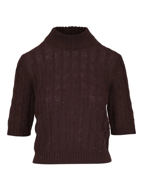 brown cable knit sequin embellishment mock neck short sleeves cropped length