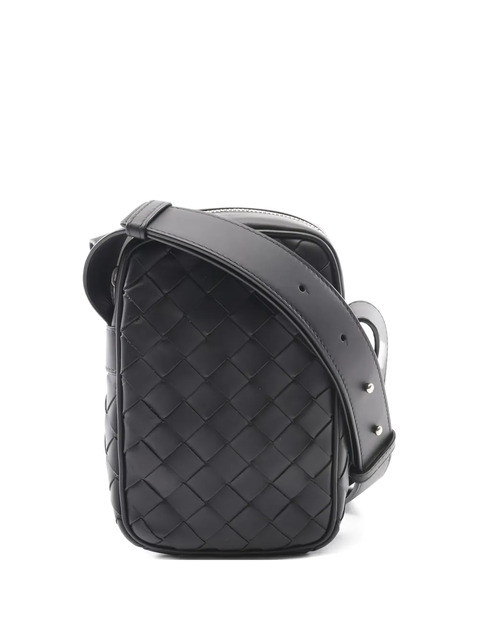 black leather signature Intrecciato design zip top fastening adjustable shoulder strap