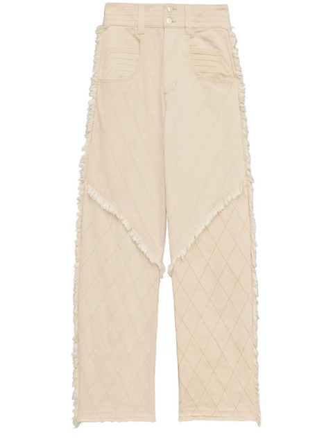 ecru organic cotton-hemp blend denim concealed fly and button fastening high-rise belt loops decorative stitching stripe detailing two rounded pockets to the sides frayed edge panel detailing diamond pattern two rear patch pockets straight hem
