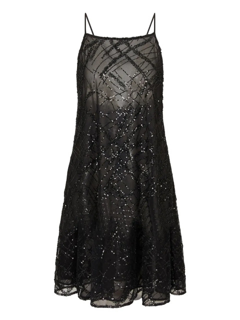 black sequin embellishment backless design spaghetti straps A-line skirt sheer overlay