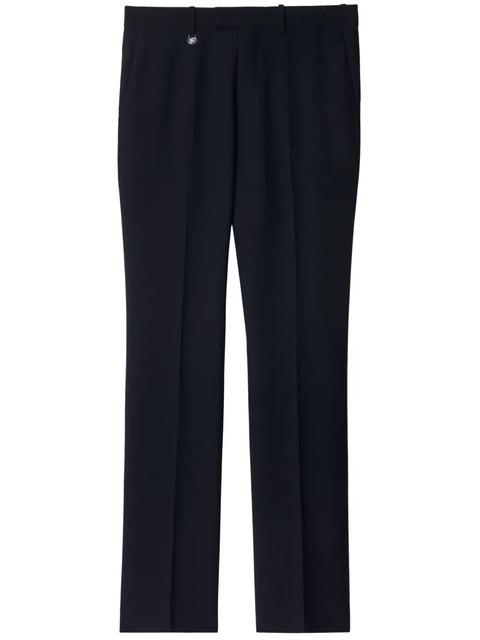 navy blue wool-mohair blend tailored design concealed front fastening belt loops pressed crease two side inset pockets rear welt pocket straight leg