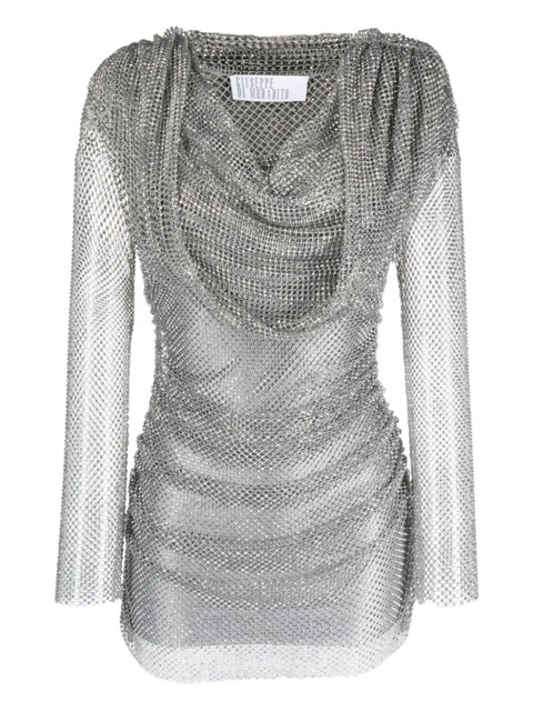 silver-tone mesh rhinestone embellishment hood long sleeves