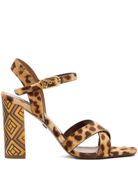 brown cheetah print cross-strap design ankle strap geometric-patterned heel block heel