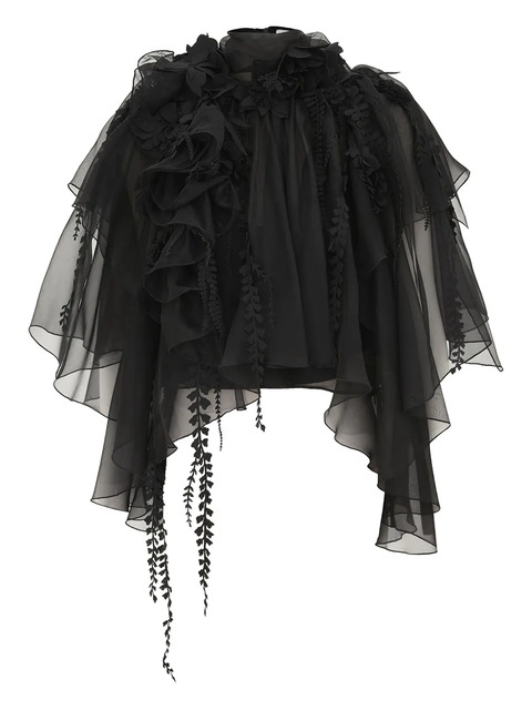 black layered ruffles floral appliqués high neck sheer fabric asymmetrical hemline