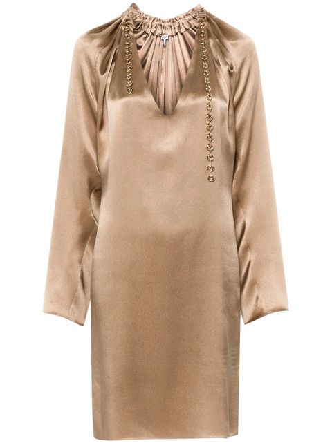 light brown silk satin weave gathered neckline with gold tone chain detail V-neck long raglan sleeves side slits slip-on style