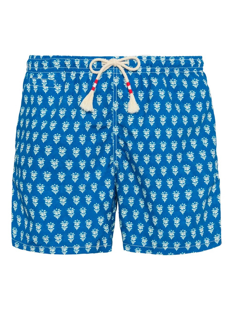 blue all-over floral pattern drawstring fastening tasselled drawstring ends buttoned welt pocket Be mindful to try on swimwear over your own garments.