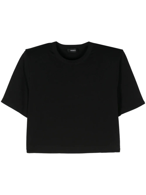 black cotton jersey texture crew neck shoulder pads short sleeves cropped straight hem