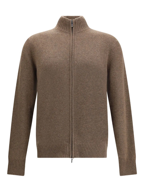 brown high neck zip front long sleeves ribbed hem ribbed cuffs cashmere