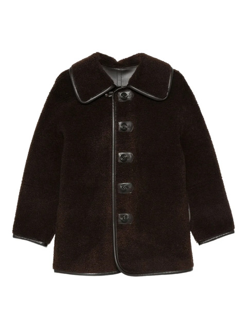 brown teddy texture button fastening loose collar faux-leather trim long sleeves