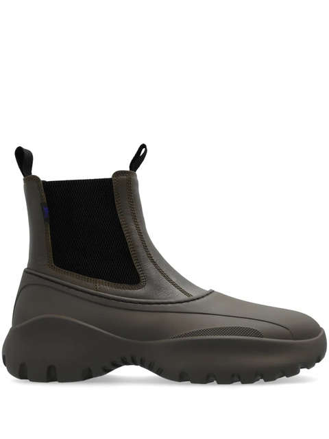 green calf leather elasticated side panels round toe double pull-tab at the opening chunky rubber sole