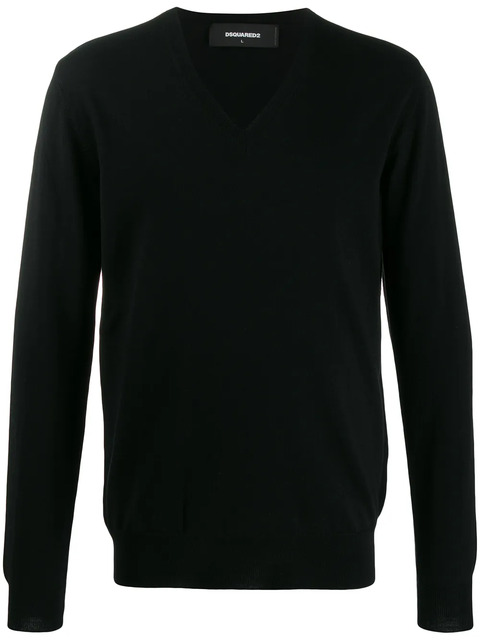 Dean and Dan Caten - the infamous designer duo behind DSQUARED2 - have a maximalist design vision that blends sports-inspired styling with tough-luxe details. This black V-neck sweater is crafted from wool and features a fine knit, long sleeves, a relaxed fit and a ribbed hem and cuffs.