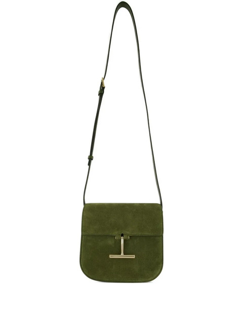 moss green suede calf leather T-bar fastening adjustable shoulder strap flap closure smooth calf leather trim